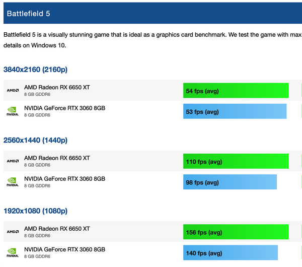 但在实际游戏(战地5)体验中RX6650XT略微领先一些。结合售价来说,RX6650XT要比RTX3060 8g便宜400左右,还是很香的!