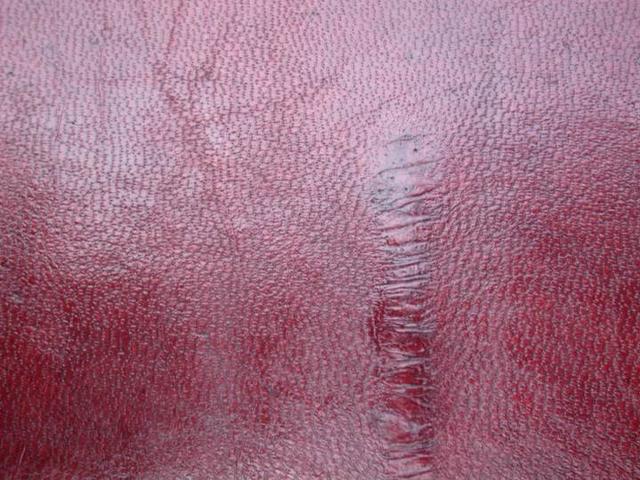 两头牛长成后,分别被剥皮取肉,完成使命。自然而然的,非洲那张牛皮,皮质疏松,布满疤痕。(就是半粒面革或者修面革)
