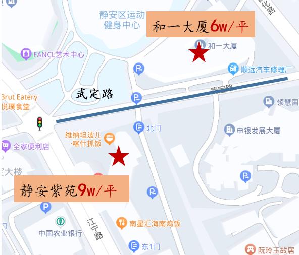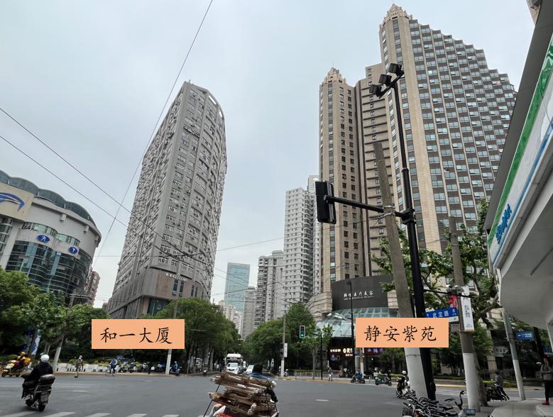 左边是静安紫苑小区单价9w/平,右边和一大厦小区单价6w/平,中间只隔了一条小马路,单价竟然相差3万。