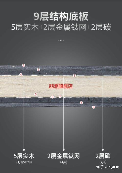 纯木底板2、碳素/纤维底板的结构通常都是5木+ 2碳,即5层纯木+ 2层碳素结构,或者是5木+ 2纤维的结构,层数-般都在7层以上。
