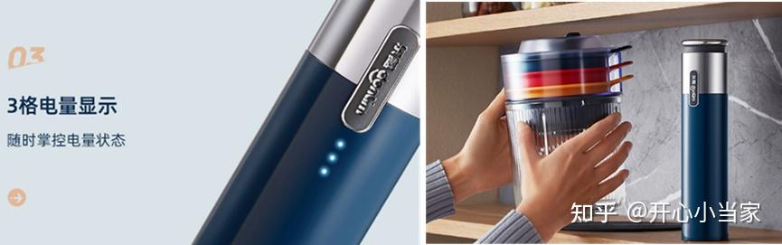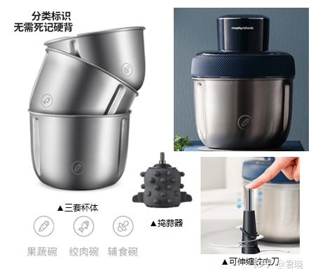 添加温控保护:当电机温度过高时会停止运作,降低引发故障和危险的隐患。双重减震防滑式设计:杯底有贴合的硅胶条,主机也是下沉式设计,运行起来更稳定。防错位卡扣设计:电机上有白色感应点,必须卡到位,电机才会工作。电机防空转设计:空转损伤电机,防空转设计,可以延长机器使用寿命。“套娃”三杯体配置:摩飞这一款配置了三件套的不锈钢杯体(被爱称为套娃),分别用于处理肉类、蔬菜和宝宝辅食。套娃的目的是做食材的分类处理,更加健康卫生,碗上有清晰的分类标志,不必担心会用混。适用场景:杯体多而小,并且主机的下沉式设计和杯体的套娃式设计让这款机型显得小巧玲珑,收纳摆放不占地方,轻奢蓝的外观,颜值非常受年轻女性喜欢,适合带着0~3岁小宝宝的三口之家。