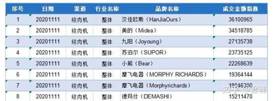 参考看看去年双11当天绞肉机品牌交易榜单: