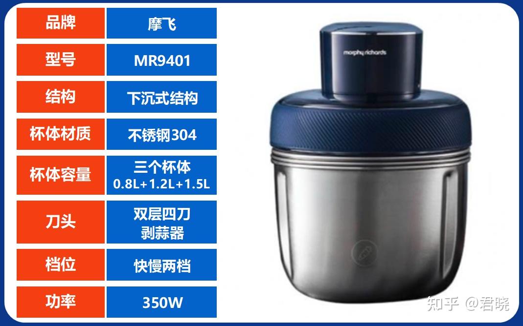 双杯体设计:生熟可分开处理,不会串味,更加健康; 大功率电机:功率达到400W,绞动快速外观设计合理:虽然是不锈钢杯体,杯盖设计较大,容易从上往下看到食材的处理情况隐藏式童锁:需机头和杯盖吻合,才可触动开关,不会误伤孩子。松手即停功能:手指松开按键,刀片即刻停止,避免馅料乱飞溅。适用场景:2L+3L杯体容量大,电机功率大,适合人口较多的家庭。推荐4、摩飞 MR9401 参考价格¥268
