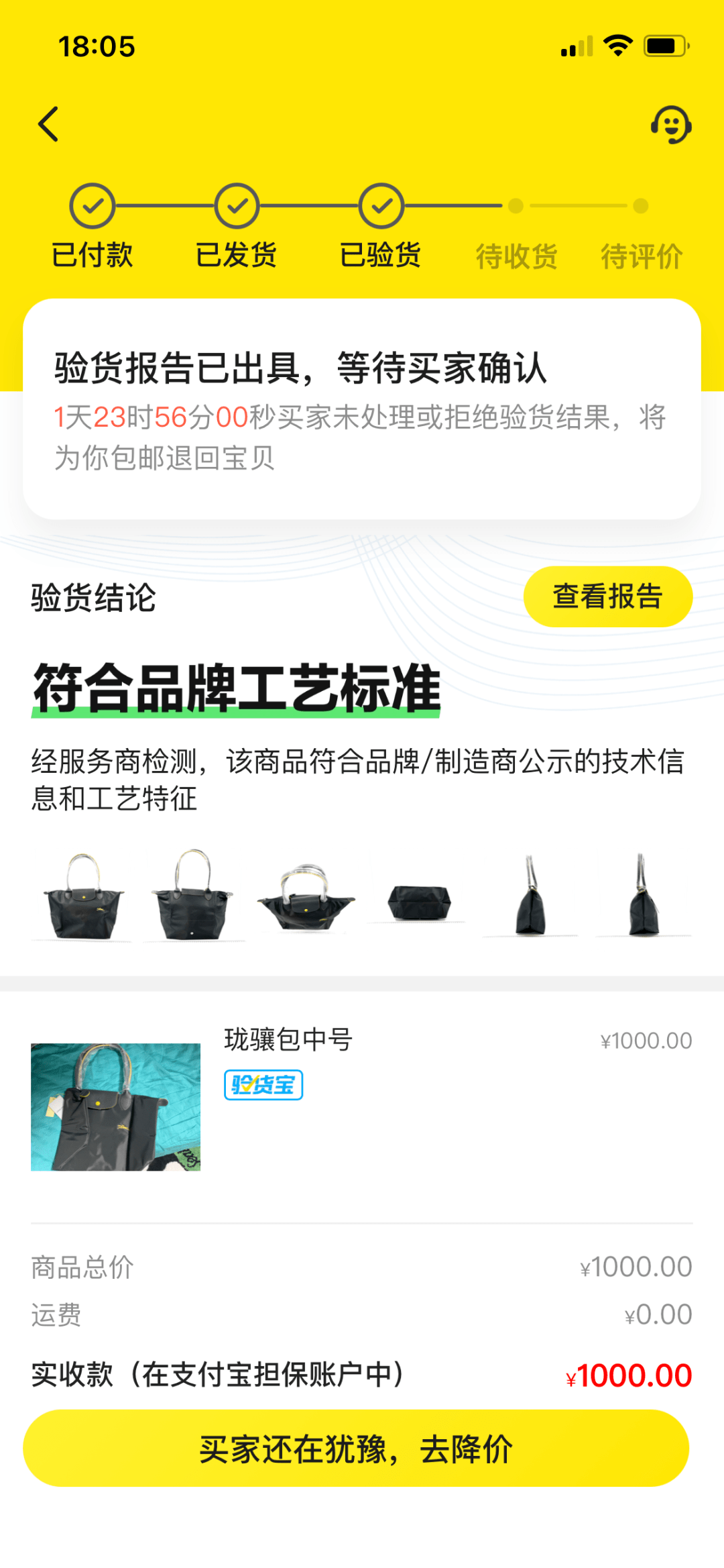 于是我把这个包挂到闲鱼,又用老笨的号拍下来了(闲鱼只有1000以上才支持走验货宝,所以我把包包标价了1000)。检验费76块,发了个顺丰邮费十几块,全下来不到九十块,不到一天就出来了结果:正品无误。