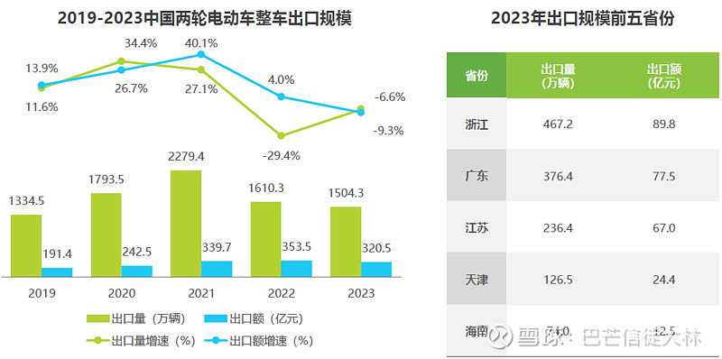 海外市场,2023年中国两轮电动车整车出口量为1504.3万辆,出口额为320.5亿元,同比下降6.6%和9.3%,下滑速度放缓;出口规模前四的省份,出口量均达到百万级;2021年疫情导致海外两轮电动车市场火爆,相应带动中国两轮电动车出口量剧增,高峰期过后市场回归正常,预计未来进入稳定增长期。