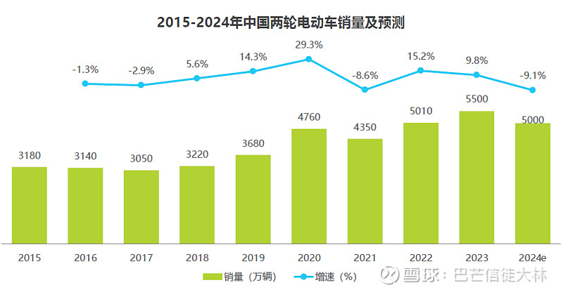 据艾瑞咨询的研究数据显示,2023年中国电动两轮车的销量约为5500万辆,相比前一年有所下降,预计2024年销量整体继续下滑至5000万辆。