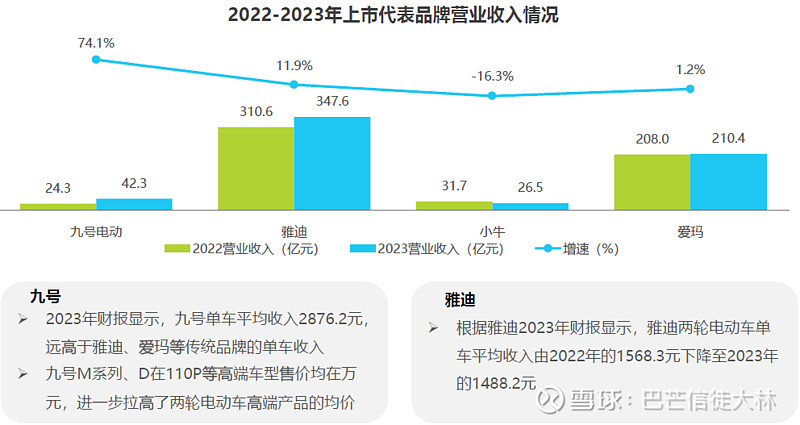 在市场份额或营收上,呈现加速集中的趋势。其中头部雅迪和爱玛科技增速明显,二三梯队相对缓慢。当然,还有以智能化和高端化为主的小牛和九号,也是增速明显,这里暂未统计。
