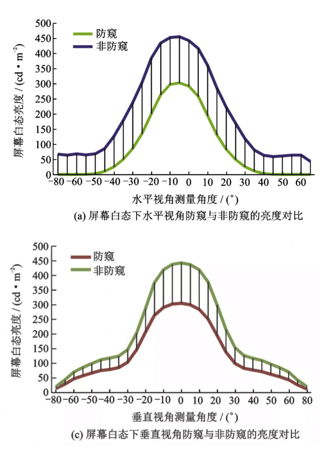 有研究对比了原始设置都是100%亮度的防窥膜手机和无防窥膜手机,在不同视角下,防窥膜对亮度的削弱都很明显: