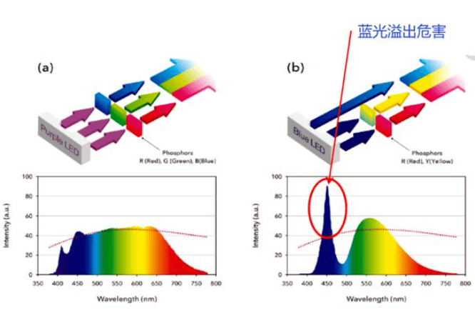 蓝光是可见光中能量较高的部分,长时间暴露在蓝光下可能增加近视的风险。传统的蓝光激发技术通常会过度强化蓝光,导致眼睛疲劳并加速近视加深。紫光激发技术不仅降低了蓝光的危害,还补充了400-420nm的紫光波段,这一波段的紫光能有效刺激视网膜中的视锥细胞,有助于保护视力,减缓近视进展。