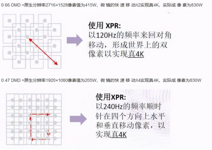 举例来说,0.47DMD显示芯片对应的分辨率为1920*1080,通过XPR技术以240HZ的频率在四个方向上水平和垂直移动像素,从而实现真4K的830万像素。同理,0.66DMD显示芯片对应的分辨率为2716*1528,则只需叠加两次,即可得到真4K的830万像素。