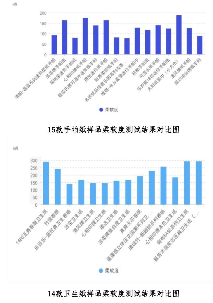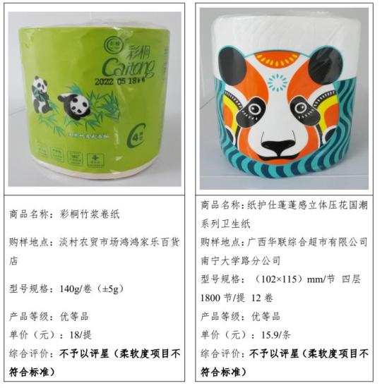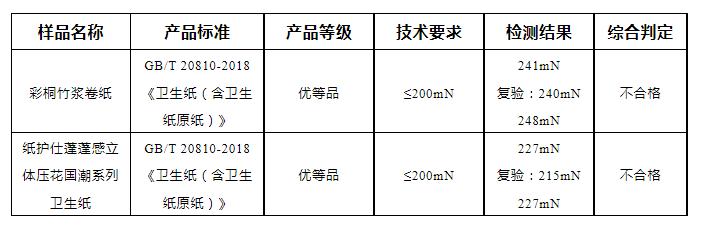 14款卫生纸样品中,彩桐竹浆卷纸、纸护仕蓬蓬感立体压花国潮系列卫生纸的柔软度不符合国家标准,这2款卫生纸样品,产品明示均为优等品,但柔软度未达到优等品的要求。