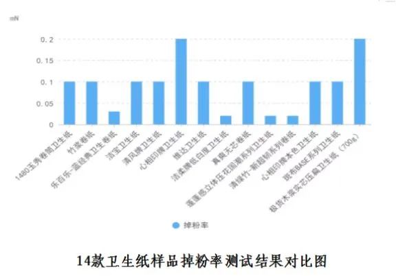 卫生纸掉粉率的国家标准要求是小于等于0.5%。测试结果显示,14款卫生纸样品的球形耐破度均符合国家标准,掉粉率数据较小,最大值为0.2%,最小值0.02%。