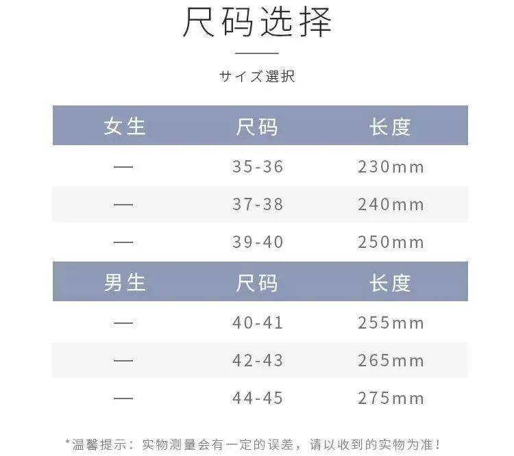 尺码表在这里,按平时穿的尺码选就行。如果喜欢宽松或脚胖的朋友,建议拍大一码~
