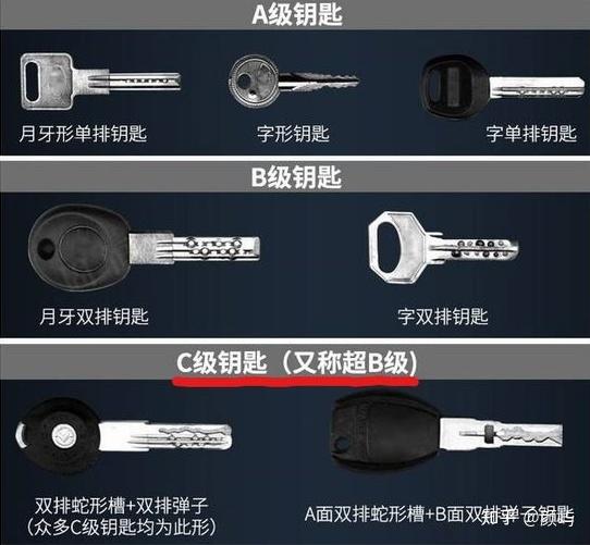 国家通过防技术开锁时间为标准,将锁芯为A/B/C(超B)三个等级,通常可以简单通过钥匙形状来进行区分属于那种锁芯。钥匙上的纹路越复杂,防盗系数越高。