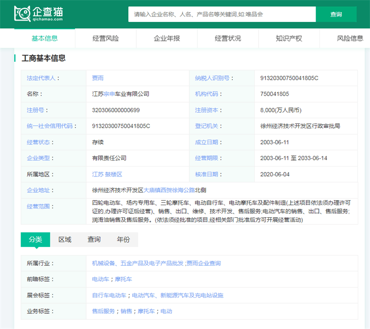 企查猫资料显示,江苏宗申车业有限公司成立于2003年,法定代表人为贾雨,注册资本约8,000万人民币。经营范围含四轮电动车、场内专用车、三轮摩托车、电动自行车、电动摩托车及配件制造出口等。