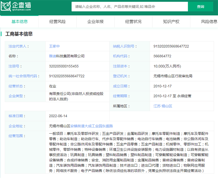 雅迪科技集团有限公司成立于2010年,该公司法定代表人为张剑,注册资本约10,000万人民币。其总部位于江苏无锡,全球拥有江苏无锡、广东清远、浙江宁波、重庆、天津、安徽金寨、越南等七大生产基地及一家工业设计技术中心 。
