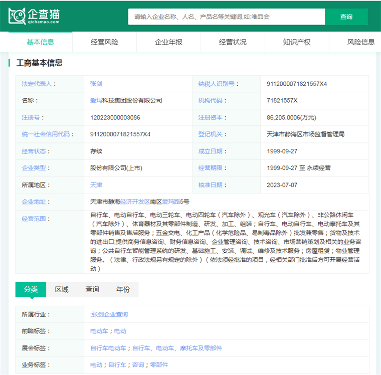 爱玛电动车是爱玛科技集团股份有限公司旗下品牌,该公司法定代表人为张剑,成立于1999,注册资本约86,205.0006万人民币。经营范围含自行车、电动自行车、电动三轮车、电动四轮车(汽车除外)等,是电动车行业头部品牌。