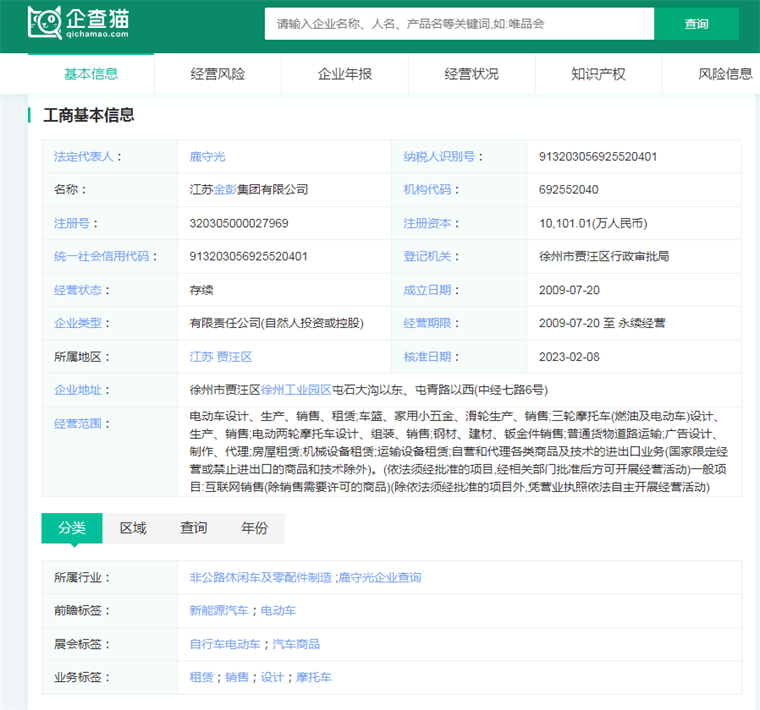 企查猫资料显示,江苏金彭集团有限公司成立于2009年,法定代表人为鹿守光,注册资本1亿人民币,经营范围含电动车设计、生产、销售、租赁;车篮、家用小五金、滑轮生产、销售;三轮摩托车(燃油及电动车)设计、生产、销售;电动两轮摩托车设计、组装、销售;钢材、建材、钣金件销售等。由鹿守光、刘静共同持股。