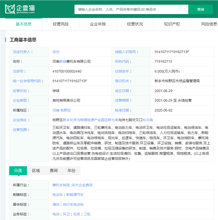 河南新鸽摩托车有限公司成立于2001年,是一家专注于新能源汽车、三轮摩托车、三轮电动车及特种车辆研发、制造、销售、服务、进出口业务为一体的现代化大型企业。法定代表人为宋方,注册资本约6,000万人民币。