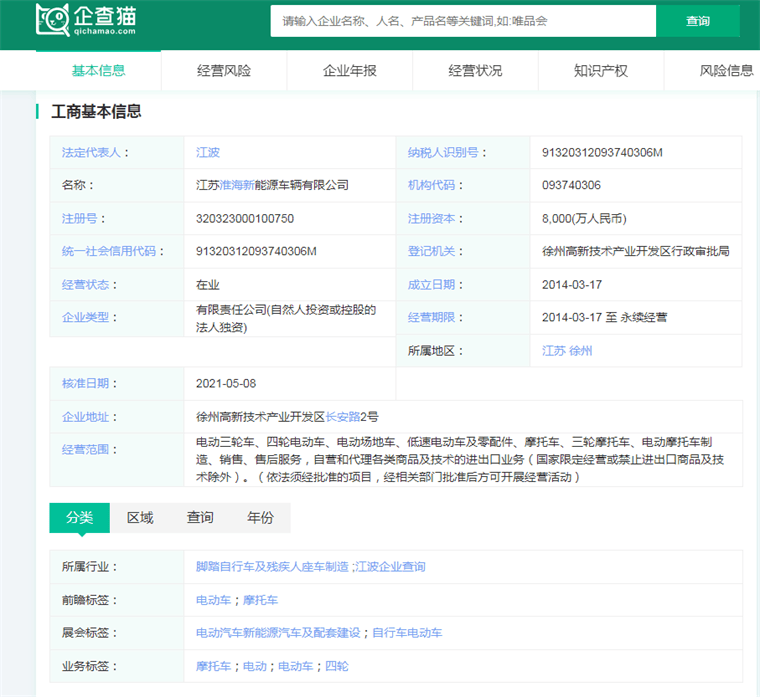 江苏淮海新能源车辆有限公司成立于2014年,法定代表人为江波,注册资本约8,000万人民币,经营范围含电动三轮车、四轮电动车、电动场地车、低速电动车及零配件,自营和代理各类商品及技术的进出口业务等。