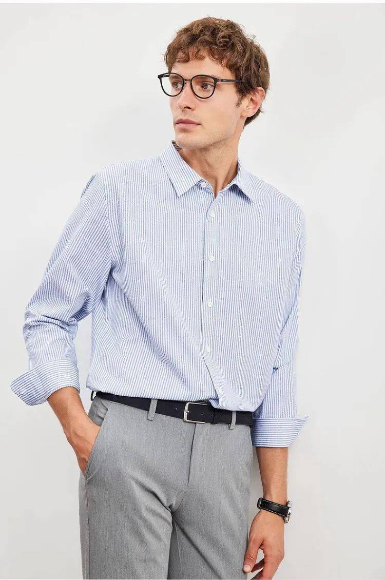 蓝条纹衬衫经典又时尚,将英伦绅士的优雅韵味融入其中,相较于纯色衬衫,多了几分灵动,为整体穿搭注入活力。