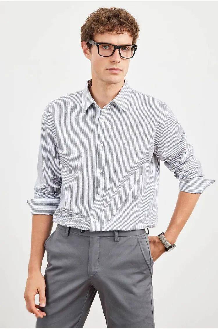 灰条纹衬衫,低调奢华,将高级沉稳的特质进一步放大,纵向条纹在视觉上有拉长身形的效果,能让穿着者看起来更挺拔、修长。