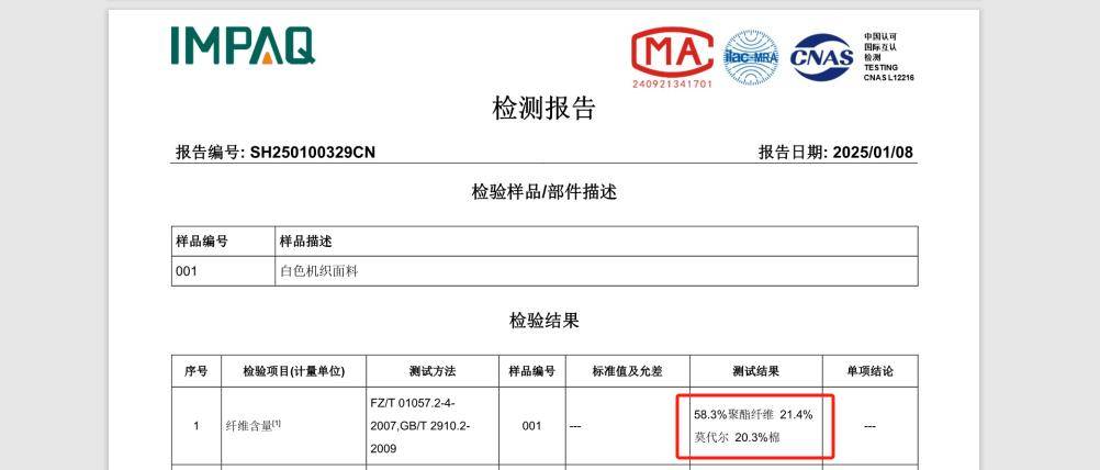 杉杉衬衫面料采用: 21.4%莫代尔+20.3%棉+58.3%聚酯纤维