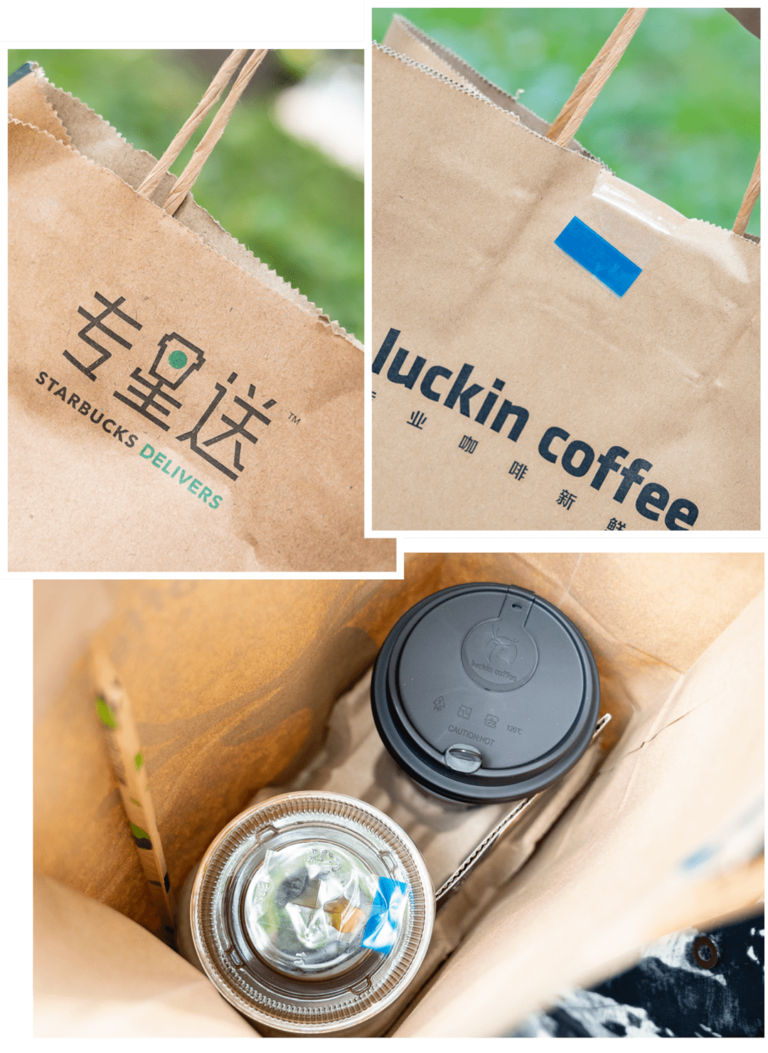 很快小编就拿到了外卖,星巴克和瑞幸的咖啡袋统一使用的是纸袋包装,各自印上了品牌logo,环保又实用。