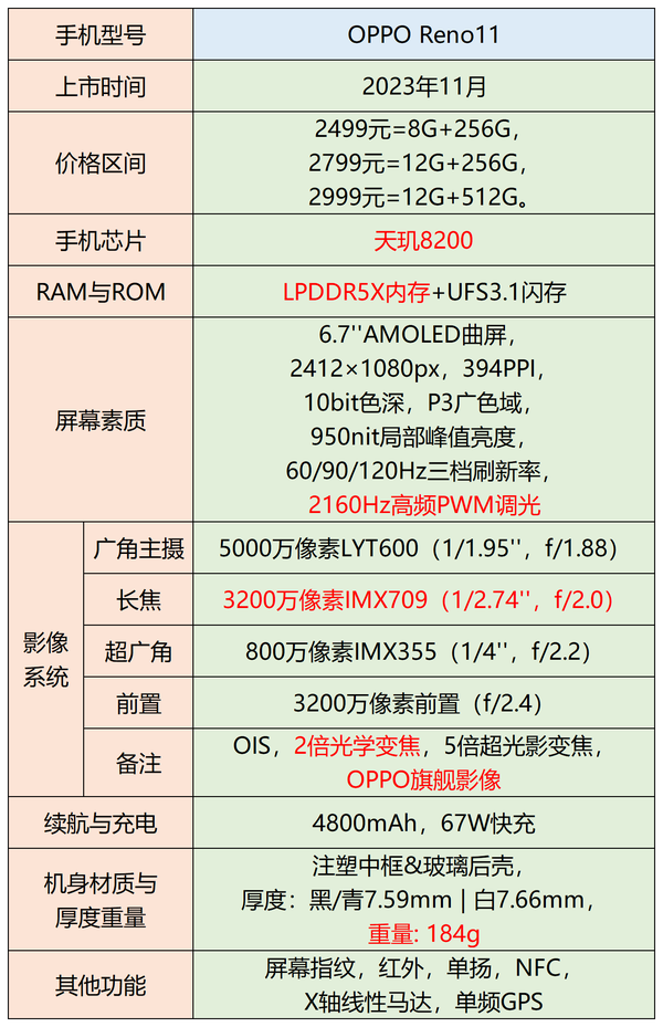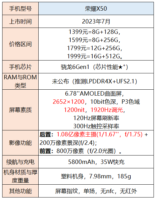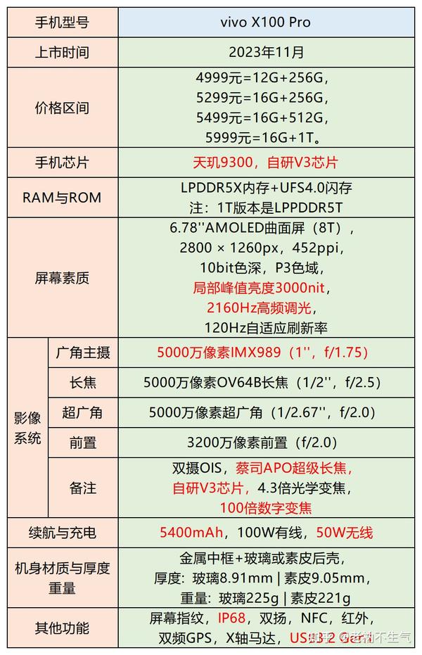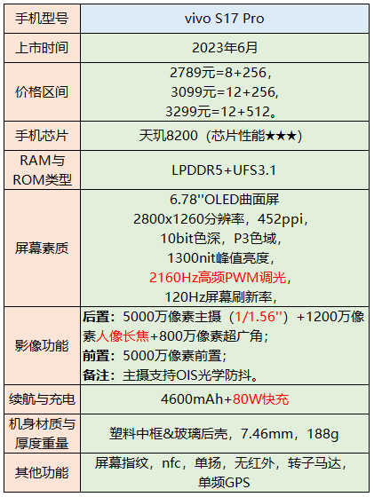 性能比较不错,三件套搭配的是天玑9200+、LPDDR5、UFS3.1。影像方面,尤其是人像拍照效果不错。主摄是IMX920,拥有1/1.55英寸大底。另外还有vivo特色的补光灯效果,在暗光下拍照效果拥有良好的效果。屏幕参数尚可,拥有2800nit的局部峰值亮度,支持2160Hz高频PWM调光。续航表现不错,拥有拍照手机相对稀缺的5000mAh大容量电池。不足: