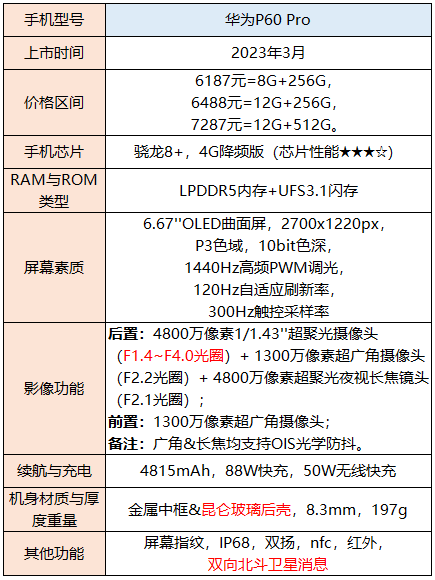 不支持5G网络,芯片、运存和闪存相比同价位手机都差一档。购机建议:对5G网无需求的人群,对夜景比较看重的人群,推荐考虑P60系列手机。品牌认可度也非常高。相比近期新出的Mate60 Pro系列而言,P60 Pro的拍照效果更好。但是在其他方面,比如双向卫星通讯方面不如Mate60Pro。