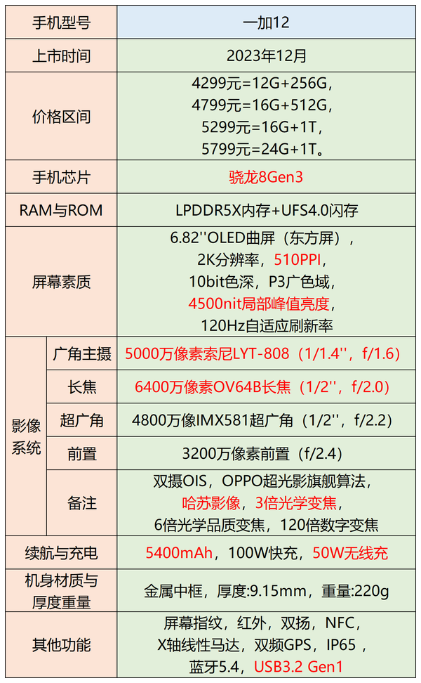 顶尖性能,一加12是骁龙8Gen3搭配LPDDR5X内存、UFS4.0闪存三件套,外加最新的ColorOS14系统,性能达到顶尖级水平。影像表现良好。硬件方面有索尼LYT-808主摄,以及两颗1/2''素质的潜望长焦和超广角加持。算法方面,有OPPO的超光影旗舰算法,外加哈苏影像加持。影像方面,软硬件均有良好的加持,拍照效果也非常不错。屏幕素质强悍。2K东方屏,拥有510PPI像素密度,最高4500nit的局部峰值亮度。在护眼方面获得了国家眼科诊断与治疗工程技术研究中心的眼健康安全评测体系 (ECAP) 测试,以及德国莱茵智能护眼3.0的双认证。续航与快充表现极佳。拥有5400mAh超大容量长寿电池,在多数首次充放电还在千次以内徘徊的时候,一加12的充放电循环次数达到了1600次。充电方面,有100W级别的有线快充和50W的无线快充。续航充电方面的综合表现力达到顶尖水平。功能齐全。红外、双扬声器、NFC、X轴线性马达、双频GPS、蓝牙5.4应有尽有。还支持4k~5k价位段相对稀缺的USB3.2Gen1。不足: