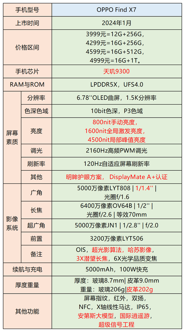 顶级性能调校,潮汐架构,天玑9300搭配LPDDR5X和UFS4.0,轻松带动各类大型游戏。让性能与续航有更好的优化与平衡。拍照方面是一颗1/1.4英寸底索尼光喻LYT808,效果极佳。长焦镜头是一颗Find N3等同款1/2英寸的OV64B,外加新一代OPPO算法和新一代哈苏影像融合,综合而言,Find X7是同价位甚至能越级的年度最佳拍照手机。功能比较齐全,支持红外、双扬、NFC、双频GPS等,同时还支持IP65级防水防尘。顶级屏幕,一加同款顶尖的明眸护眼屏。不仅各项参数爆表,护眼也是顶级效果。性价比极高。Find X7加量不加价反降价。各方面功能相比上一代有了非常多的提升。不足: