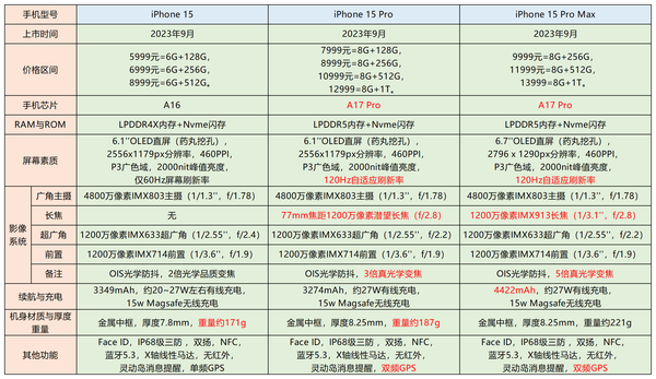 不过在重量方面标准版是最轻的,只有171g,这也是标准版的唯一优势。但其实Pro版的重量也不重,只有187g。而Pro Max由于尺寸要明显大一些,重量也达到了221g左右,明显比另外两款重不少。选购建议来说的话,综合考虑到配置的价格因素等问题。这个系列里比较推荐的是iPhone15 Pro里的256G版本。既在各个功能方面达到了很不错的水准,同时在价格方面也尚可接受。