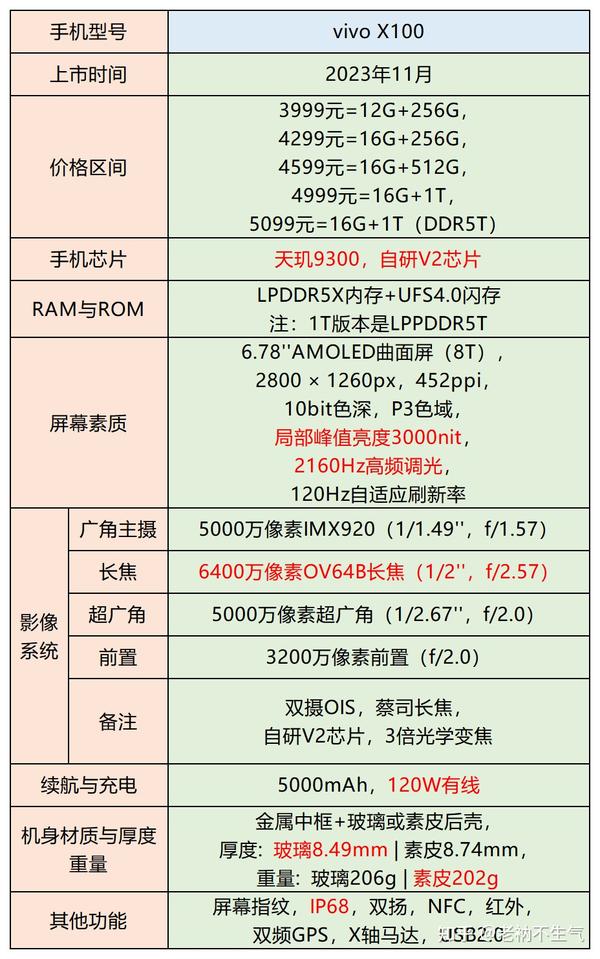 性能强悍,天玑9300芯片全方位升级,大核模式下的新架构目前看起来无论是综合性能还是能效控制都处于非常强悍的状况。影像算法有所升级,尤其在长焦方面有了明显加强,成像素质佳。另提升了视频拍摄能力。续航快充给力,200g左右的轻薄机身下,拥有5000mAh大容量电池+120W的有线快充。外加专门优化了待机状态下的电量损耗问题,整体体验效果好。蓝心AI大模型,能更方便的高效解决各类问题。不足: