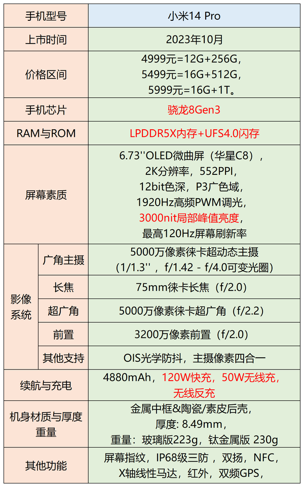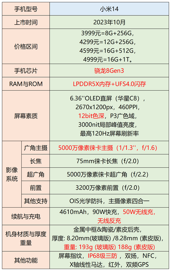 骁龙8Gen3、LPDDR5X、UFS4.0性能三件套,日常使用极为流畅,轻松带动大型游戏。小米龙晶玻璃,更加坚固耐划。屏幕参数表现较好,12bit色深,最高支持3000nit峰值亮度。主摄支持1024级可变光圈,增加拍照可玩性。功能齐全,支持常见的红外、双扬、NFC、X轴马达、双频GPS、IP68三防等。不足:
