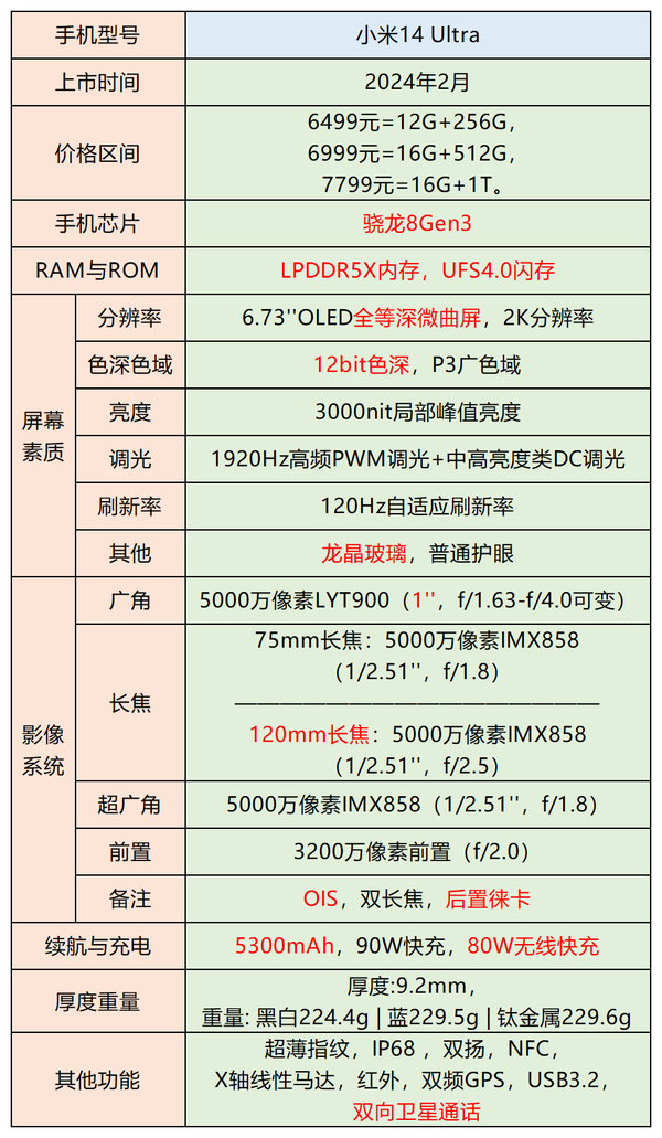 性能强悍的,骁龙8gen3、LPDDR5X、UFS4.0,性能释放强悍、运行流畅、轻松带动各类大型游戏。相比上一个档次的手机,小米14 Ultra在影像方面做了大幅升级,用上了索尼IMX989的1英寸大底,后置三镜头全有徕卡加持。另有75mm和120mm焦段可用,焦段覆盖齐全。同时在影像方面,补齐了上一代13U在长焦微距方面的缺失。续航快充方面,14U给到了5300mAh超大容量电池,外加90W有线快充和行业顶尖的80W无线快充。能满足快节奏的充电需求。支持双向卫星通话,对于有无信号区域旅游或工作人群有较大需求。不足: