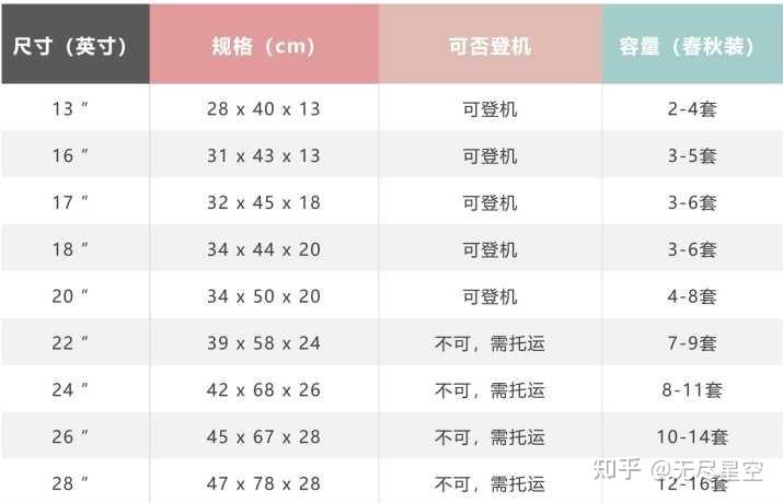 软箱4.如何选到最合适的行李箱尺寸首先,常见的行李箱尺寸分为可登机和不可登机两种,以20寸为界限,20寸和18寸为登机箱,以上的需要托运。20寸以上的常见尺寸如下图所示,一般有22、24、26、28、32这么几种。