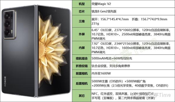 搭载了一块4英寸1092P分辨率超大外屏,是目前外屏尺寸最大的小折机型,外屏玩法比较丰富,交互体验极佳;内外屏均支持1-120Hz自适应刷新率,外屏支持2160Hz高频PWM调光、1600nit全局峰值亮度,内屏支持3840Hz高频PWM调光、1500nit全局峰值亮度,内外两块屏幕的素质都极高;机身轻盈(重193g,展开薄至7.15mm),且搭载有4800mAh电池,是目前小折机型里“轻薄大电池”的典型代表;颜值蛮高,手感不错;搭载骁龙8+ Gen1芯片、超薄VC液冷散热,可以确保日常使用的流畅和稳定性;前置IMX816自拍镜头,后置IMX906主摄+1200W超广角,拍照尚可,且拍照玩法极多;搭载Magic6系列同款荣耀自研射频芯片C1+,在信号方面具有优势。不足: