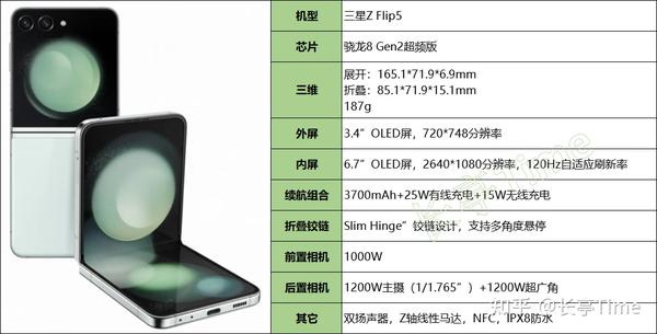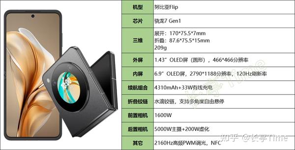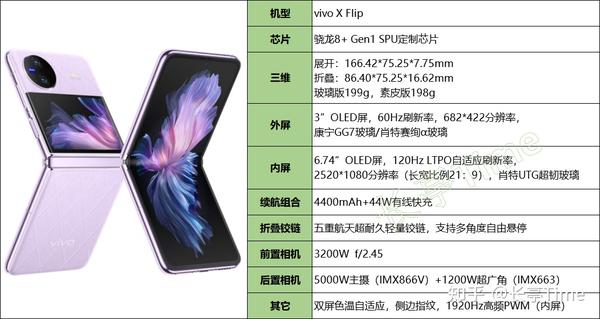 搭载骁龙8 Gen2超频版芯片、LPDDR5运存、UFS 3.1闪存的组合,性能强悍;采用“Slim Hinge”铰链设计,折痕控制不错,支持多角度自由悬停好评;机身重187g,厚6.9mm(展开状态),非常纤薄轻巧;后置1200W主摄(1/1.765英寸,OIS光学防抖)、1200W超广角,拍照体验尚可;搭载3.4英寸外屏,面积较大,且交互玩法蛮多;内屏支持120Hz自适应刷新率。不足: