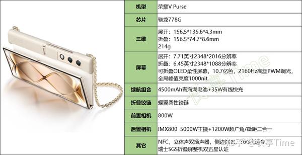 荣耀V Purse是目前最轻薄的横向折叠屏手机,同时也是目前较少可选择的横向外折叠屏机型之一。