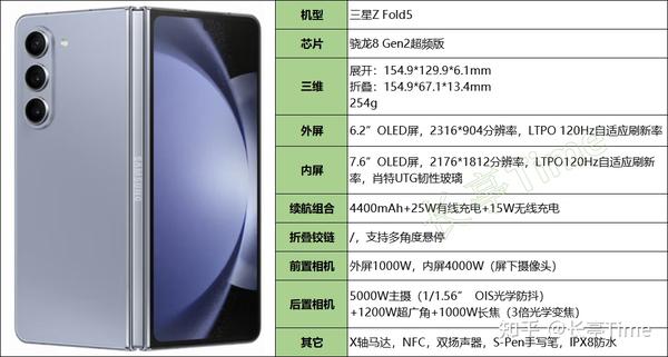 搭载骁龙8 Gen2超频版芯片、LPDDR5运存、UFS 4.0闪存的组合,性能强悍;机身重254g,厚6.1mm(展开状态),相对轻薄,手感不错;支持多角度自由悬停好评;支持S-Pen手写笔好评;内屏搭载屏下摄像头,全面屏视觉体验不错;后置5000W主摄(1/1.56英寸,OIS光学防抖)+1200W超广角+1000W长焦镜头,拍照蛮强。不足:
