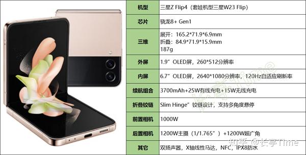 三星Z Flip4(以及三星W23 Flip)延续前作的竖向折叠设计,性能更强,内外屏的屏占比都更高,另外后置影像体验更强。