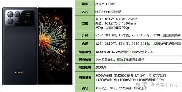 搭载骁龙8 Gen2领先版芯片+LPDDR5X运存+UFS 4.0闪存的组合,性能强悍;机身重255g/259g,厚5.26mm厚(展开状态)、10.96mm(展开状态),手感尚可;搭载小米龙骨转轴,支持多角度自由悬停好评;内外屏均搭载E6材质AMOLED屏,屏幕素质都极高;搭载4800mAh电池+67W有线充电+50W无线充电,续航体验还不错;后置IMX800主摄+1200W超广角+双长焦镜头,支持5倍潜望式光学变焦,拍照体验极佳。不足: