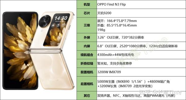 搭载天玑9200芯片,性能蛮强;前置IMX709自拍镜头,后置IMX890主摄+4800W超广角+IMX709中焦人像镜头,拍照体验不错;机身小巧,尤其折叠后仅有手掌心大小,比较便携;内屏为6.8英寸三星E6材质AMOLED屏,支持LTPO 120Hz自适应刷新率+1440Hz高频PWM调光,屏幕素质极高;外屏为3.26英寸柔性OLED屏,用于自拍、信息浏览、拨打电话等非常方便;支持多角度自由悬停好评。不足: