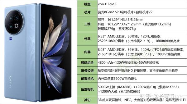 搭载骁龙8 Gen2 SPU定制芯片,配合增强版LPDDR5X运存、UFS 4.0闪存、自研V2芯片,性能输出强悍,游戏表现极佳;搭载航天级FS4碳纤维轻量铰链,在折痕优化、耐摔性、稳固性、以及轻量化体验等方面极具优势,且支持多角度自由悬停;搭载内外双3D超声波屏幕指纹,是目前少有内外两块屏幕均支持指纹解锁的折叠屏机型;内外两块屏幕均搭载三星E6材料AMOLED屏,均支持最高120Hz刷新率,其中内屏支持LTPO自适应刷新率,兼顾流畅体验与省电与一体,屏幕素质极高。后置IMX866主摄+IMX663超广角+IMX663人像镜头,拍照体验蛮强;搭载4800mAh电池+120W有线快充+50W无线快充,续航体验不错,充电速度在已发布折叠屏机型里属于绝对第一梯队。不足: