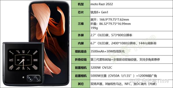 搭载骁龙8+ Gen1芯片+LPDDR5运存+UFS 3.1闪存的组合,性能强悍;搭载第三代星轨转轴+多维联动双轴铰链,折叠体验稳定,最大限度避免折痕产生,且支持多角度自由悬停极为好评;内屏支持144Hz刷新率、类DC调光,外屏交互玩法蛮多;搭载1/1.55英寸大底5000W后置主摄(OIS光学防抖)+1300W超广角,拍照体验尚可;机身重198g,厚7.62mm(展开状态),且在空间有限的机身里塞入立体声双扬声器、X轴线性马达,非常好评;性价比极高。不足: