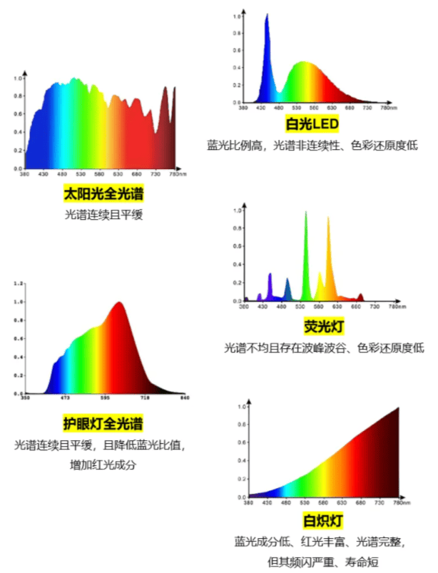 1、注重全光谱:目前市面上存在着蓝光和紫光激发的两种光谱,通常蓝光激发的光谱中蓝光峰值比较高,而紫光激发的光谱能够减低并削弱蓝光,所以建议大家选择紫光激发的全光谱护眼灯,同时如果有增加补全红光的技术,那就更好了。