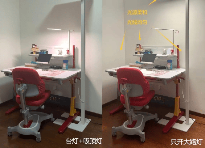 像我们小时候就是因为只开一个小台灯,使得光照区域有明暗差,导致眼睛为了适应光线变化会被迫不断收缩、扩张,处于一个紧张的视觉状态,这样不仅会使得视觉疲劳感加剧,还会损害视力健康,而“护眼大路灯”这种通过双发光面的工作原理,能够减少明暗差同时能够让光线更均匀,让孩子的目前以及所处之处都是均匀且舒适的环境光,这样在视觉上不容易累眼睛,也印证了改善用眼环境来保护眼睛视力的依据。