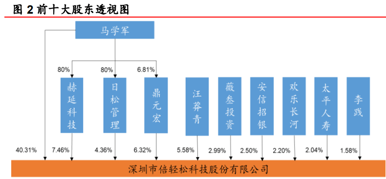 公司创始人兼实控人马学军先生直接持股2484.85万股,持股比例为40.31%。此外,马学军先生还分别通过赫廷科技、日松管理,以及鼎元宏间接持有公司7.46%、4.36%、6.32%的股份。