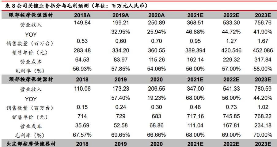 2、颈部按摩器:行业处于快速扩容期,公司产品知名度不断提升,面对竞争对手冲击不断推出较高性价比产品,伴随疫情趋缓线下门店扩张,预计2021-2023年收入同比增速分别为 68.0%、56.0%、44.2%;